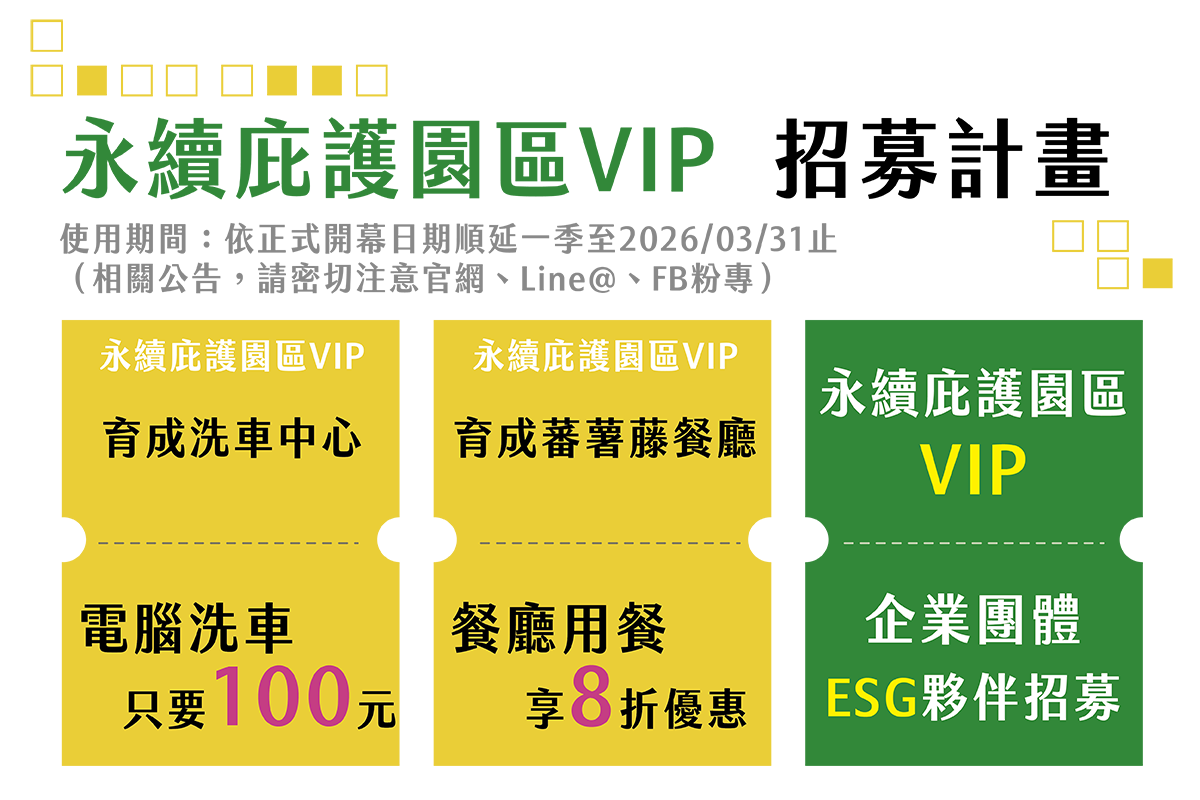 - 每月定期捐款500元至少6個月(含),享園區VIP優惠