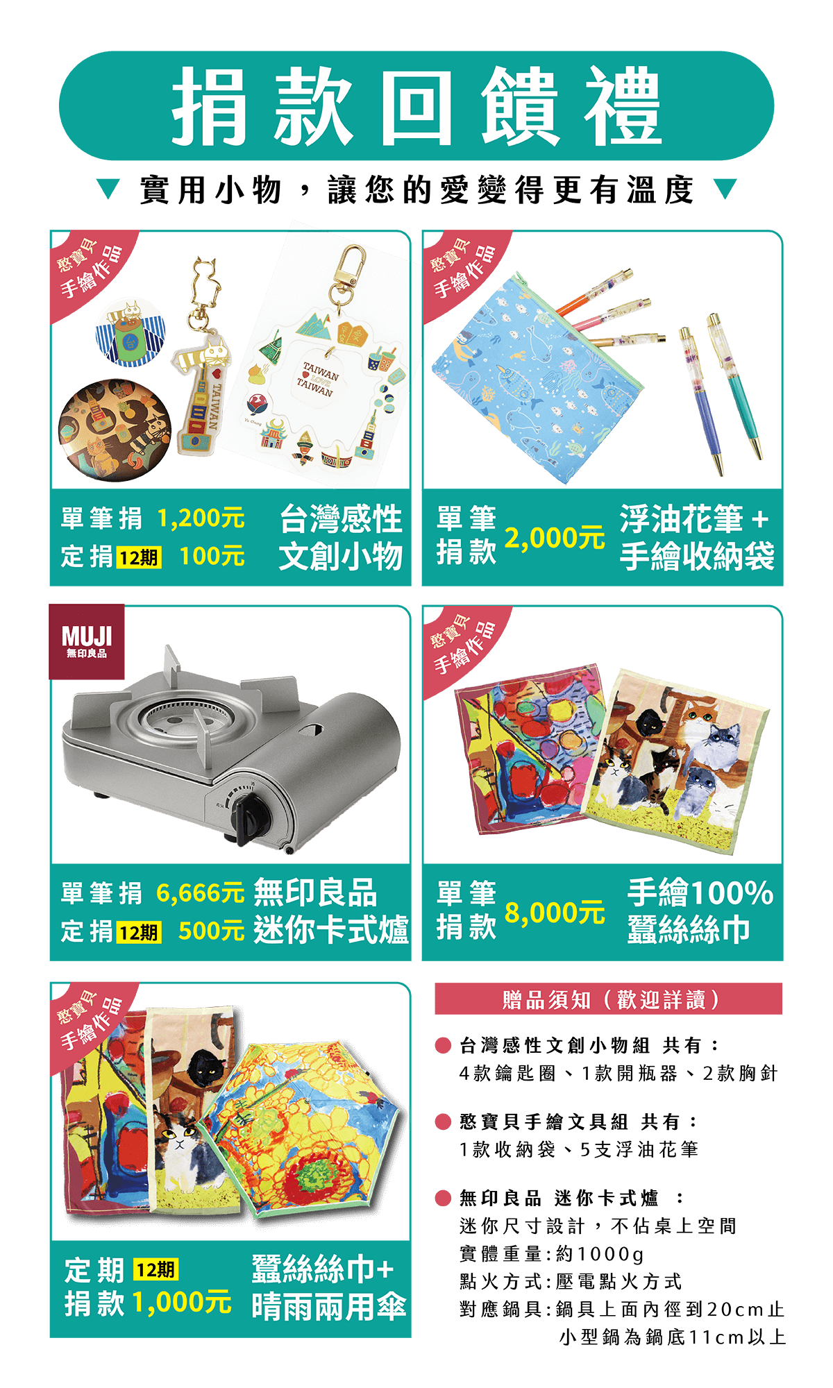 - 每月定捐500元至少12個月(含),贈無印良品迷你卡式爐 乙組(限量款)